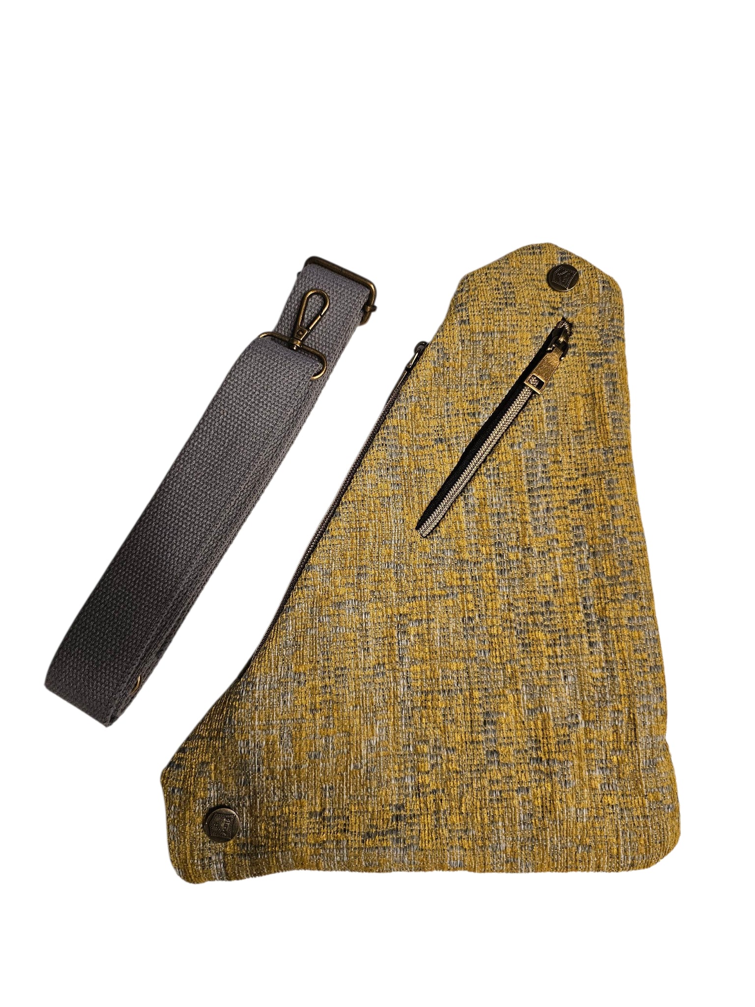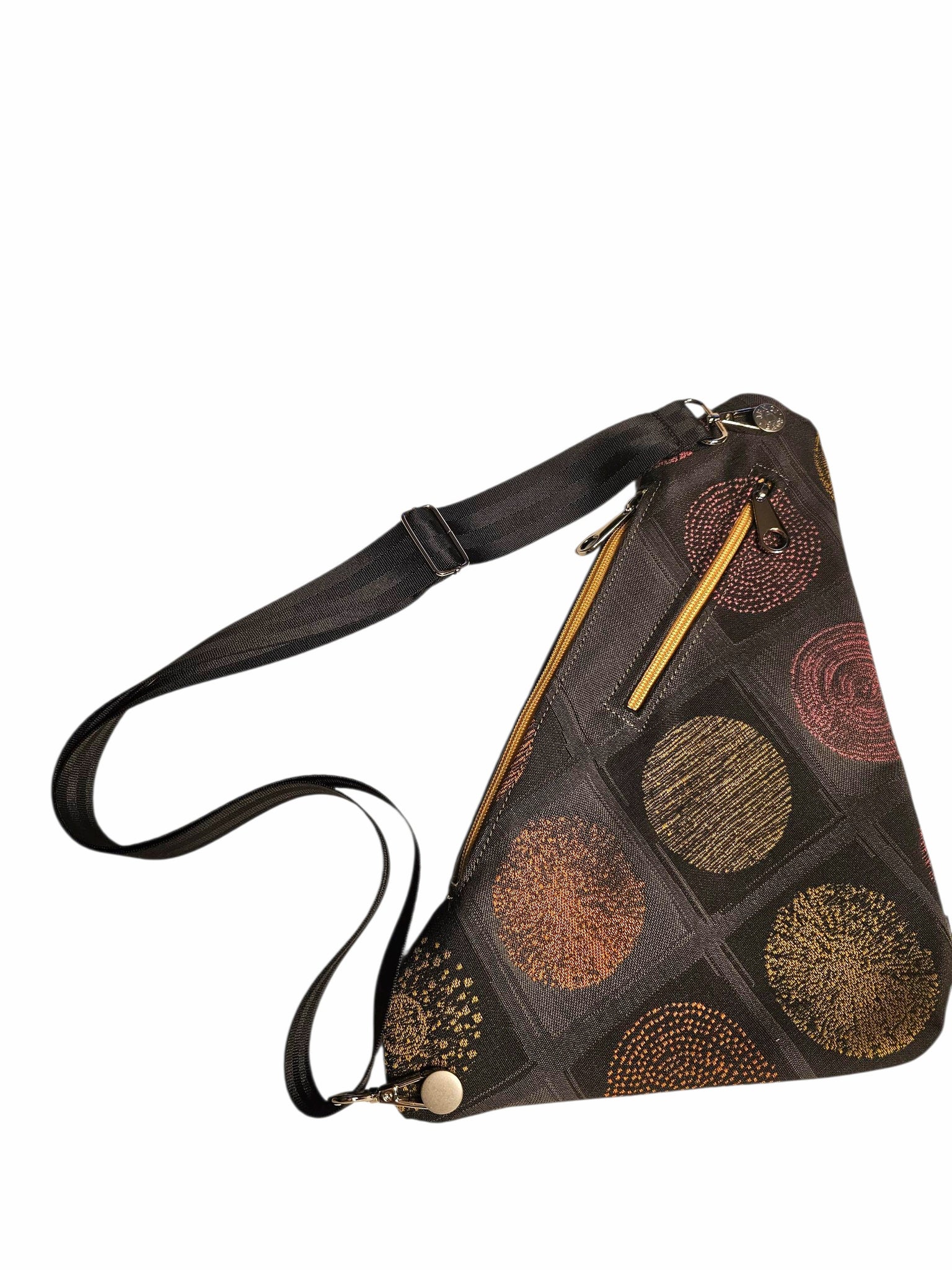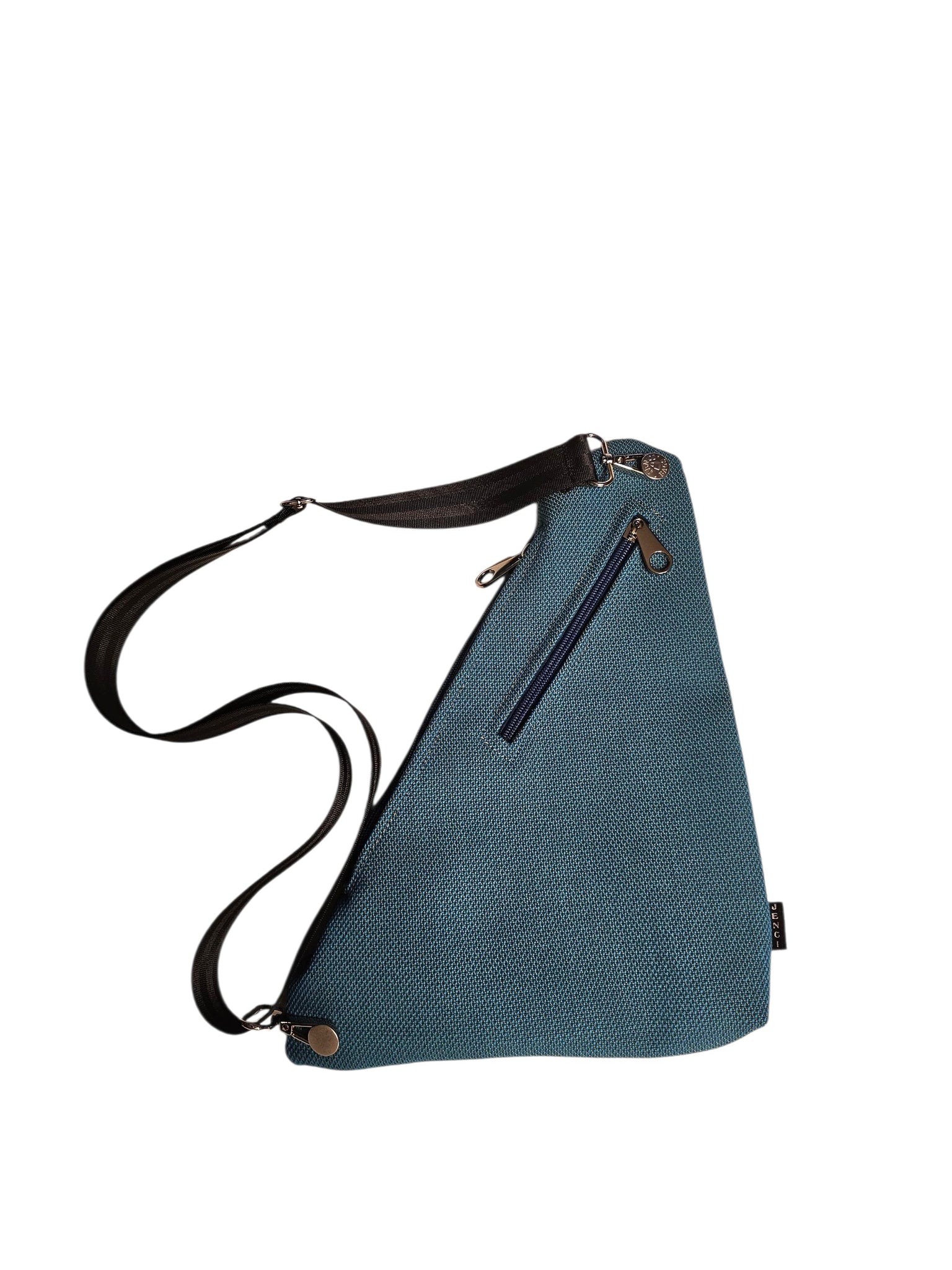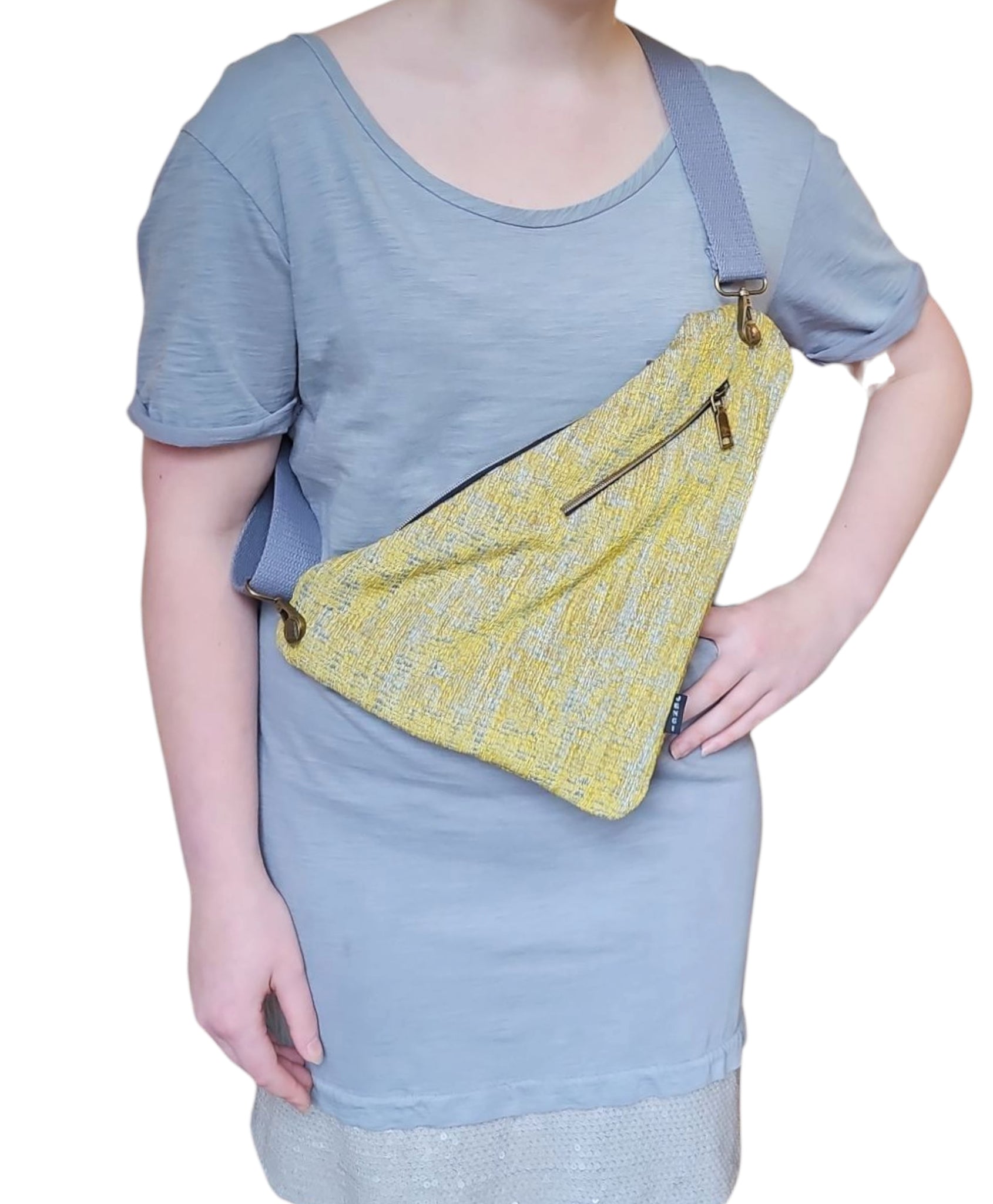 Thin and light weight sling bag that can be worn front, back or around your waist! Two separate pockets and djustable strap. Measuring 13x10 inches